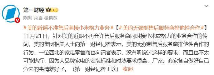 据第一财经体育游戏app平台,11月21日,针对好意思的近期不再允许售后办事商同期接小米或格力的业务协作的传闻,好意思的集团关联东说念主士向第一财经记者暗意,好意思的无强制售后办事商排他性协作的步履。