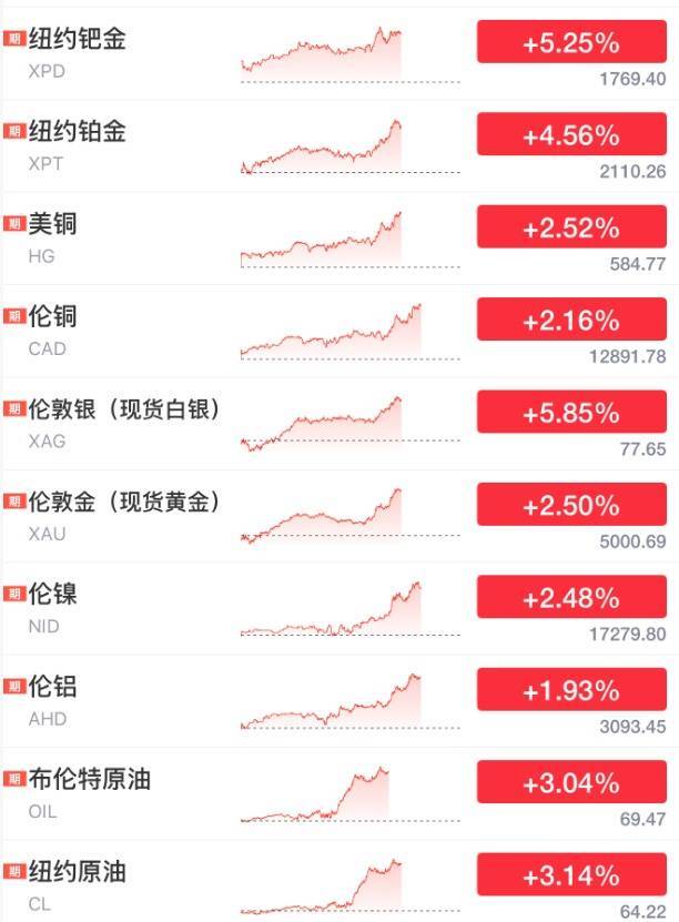 18日晚间,除了股市以外,原油暴涨3%,贵金属全线走高,黄金大涨2.5%,再次站上5000好意思元/盎司,现货白银暴涨约6%。